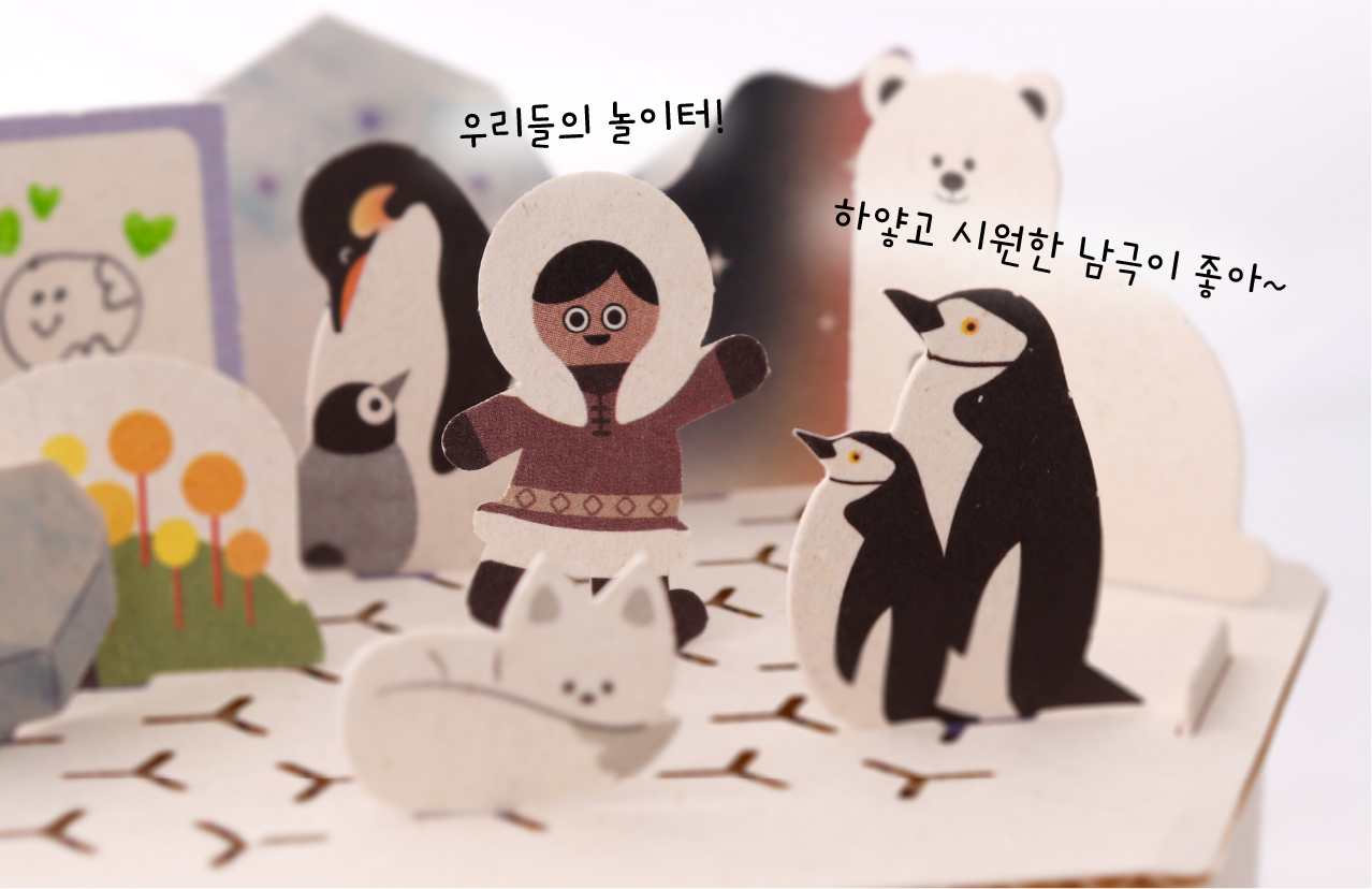 종이 인형의 앞면에는 귀여운 동식물의 모습이, 뒷면에는 이름과 멸종위기 등급이 적혀 있어요. 인형을 꽂으면서 나만의 이야기를 만들면 자연스럽게 환경감수성이 커질 거예요!