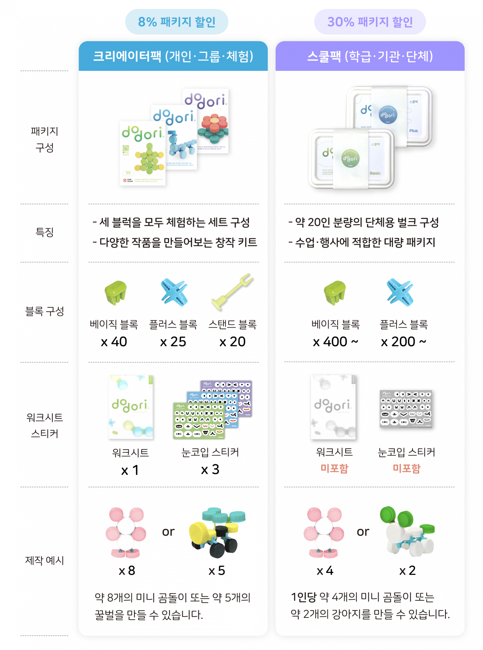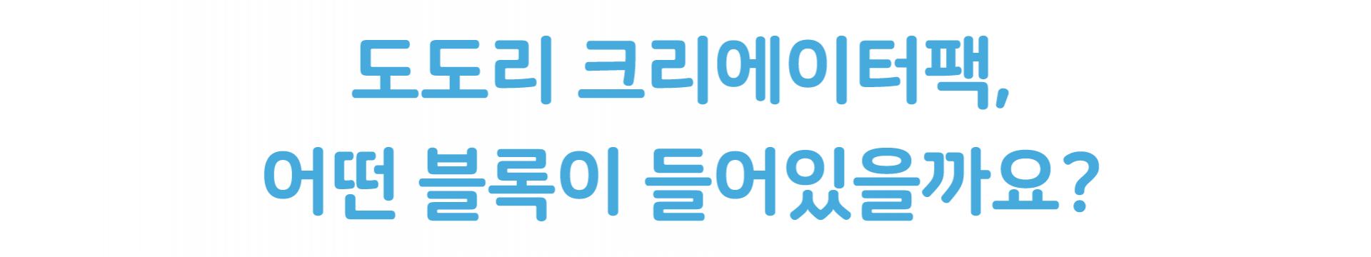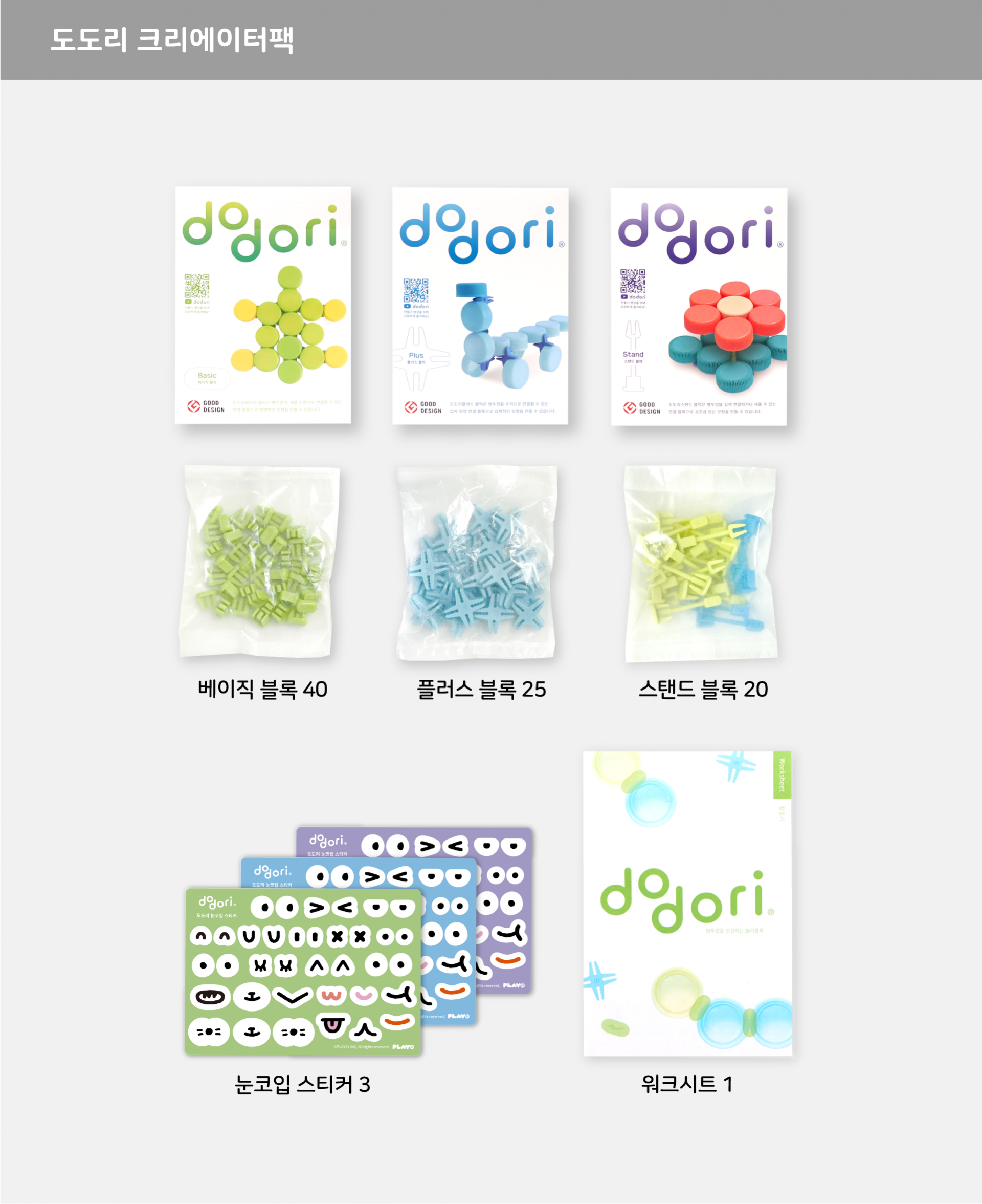 '도도리 크리에이터팩'은 도도리 베이직, 플러스, 스탠드 블록을 모두 경험해볼 수 있는 세트 패키지입니다.