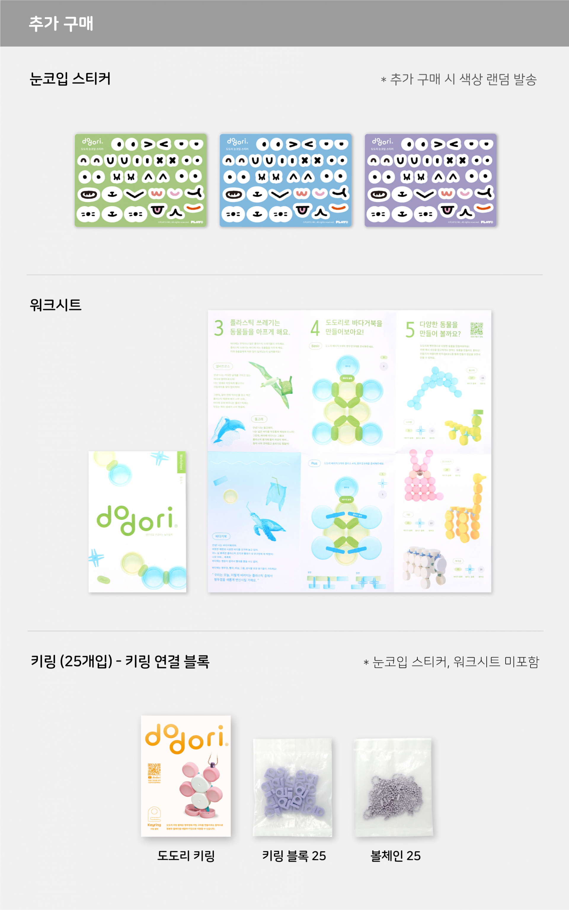 도도리는 ʻ병뚜껑을 연결하는 놀이 블록’으로, 병뚜껑이 포함되지 않는 제품입니다. 제품이 배송되기 전까지 설레는 마음으로 버려지는 병뚜껑을 모아 주세요! 병뚜껑을 모은 만큼 놀이는 풍성해지고, 지구에는 가벼움을 선물할 수 있습니다.