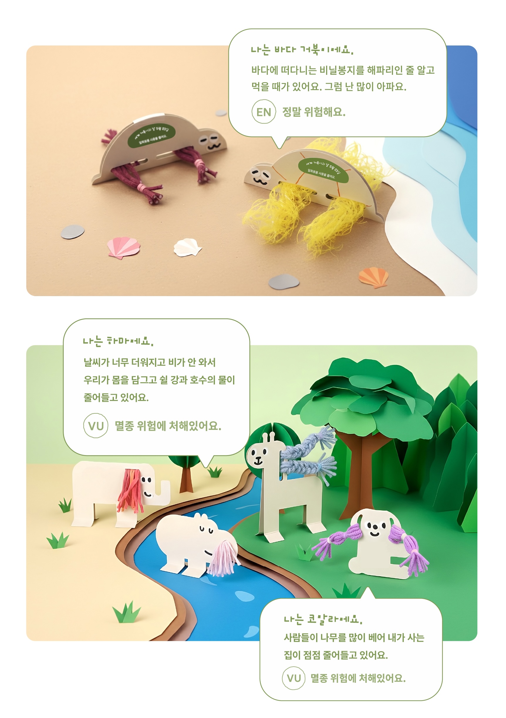 각각의 동물들이 위험에 처한 이유를 알아보고 멸종위기 동물을 직접 만들어보아요.