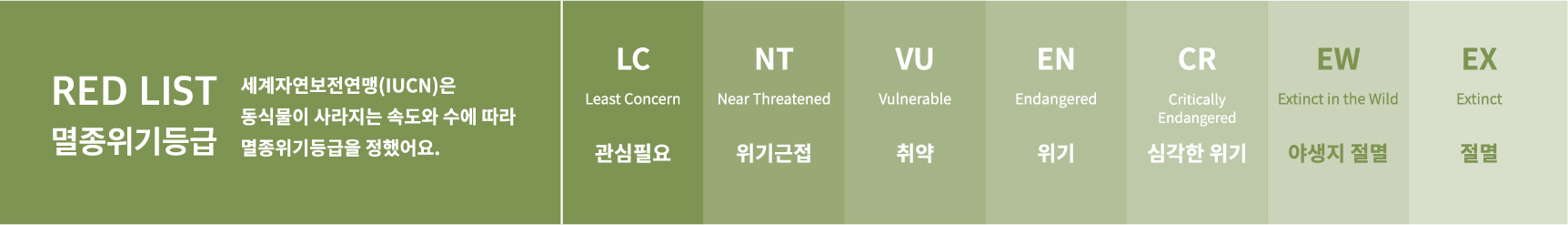 국제 자연보전연맹(IUCN) 적색목록에 따르면, 많은 생물이 이미 멸종위기 단계에 놓여 있어요. 각각의 동물들이 위험에 처한 이유를 알아보고 멸종위기 동물을 직접 만들어보아요.