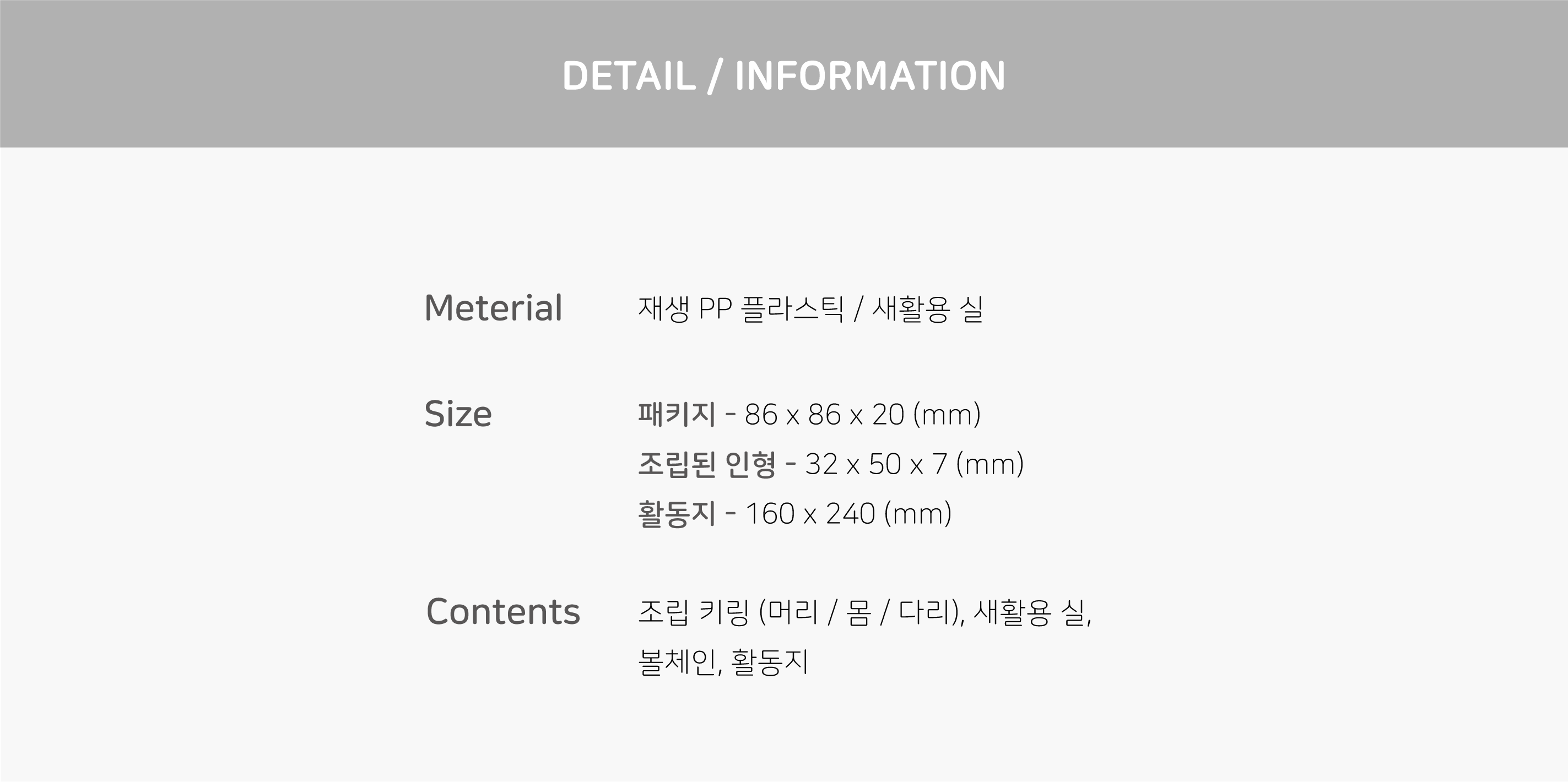 * 조립 키링(머리/몸/다리), 새활용 실, 볼체인은 랜덤 구성됩니다.